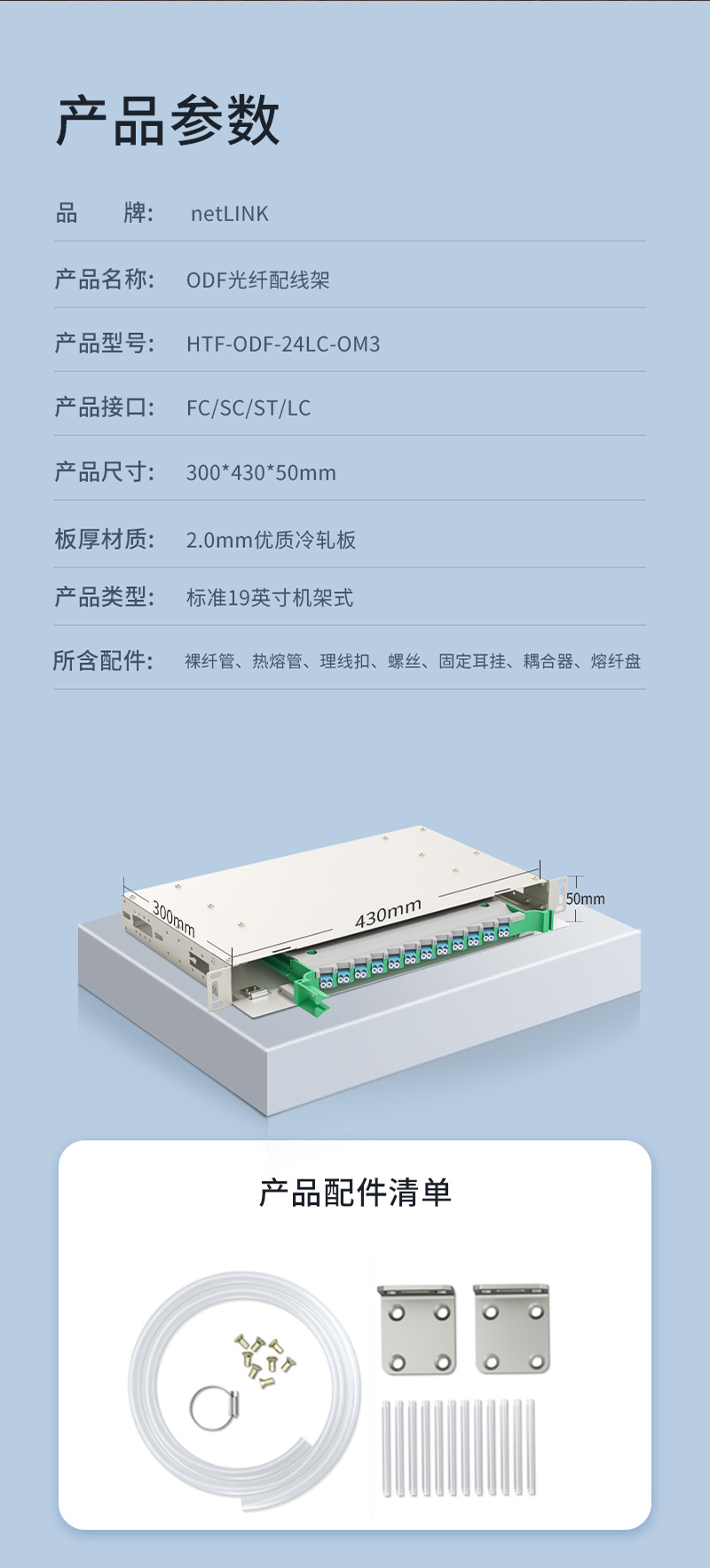 24芯ODF光纤配线架 满配万兆多模OM4尾纤LC 19英寸抽拉机架式单元熔纤盘